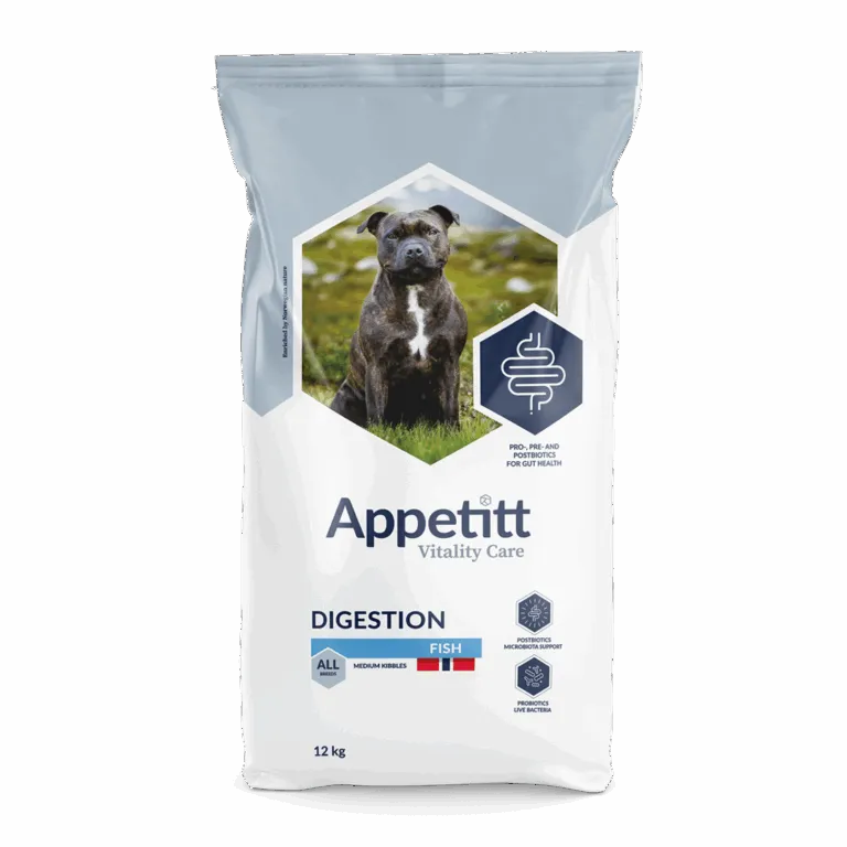 Appetitt Vitality Care Digestion Fish er et fullfôr for voksne hunder over ett år som trenger ekstra støtte til fordøyelsen.