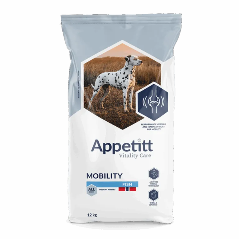 Appetitt Vitality Care Mobility Fish er et fullfôr utviklet for voksne hunder over ett år, med behov for ekstra støtte til ledd og bevegelighet.